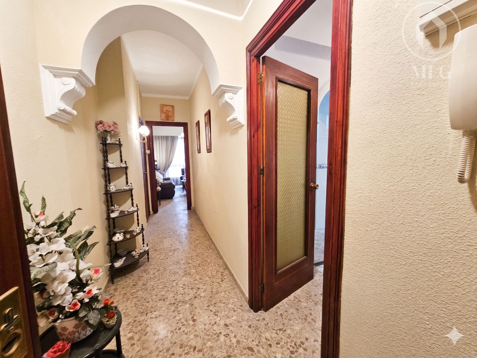 Pasillo distribuidor equipado con un generoso armario empotrado.